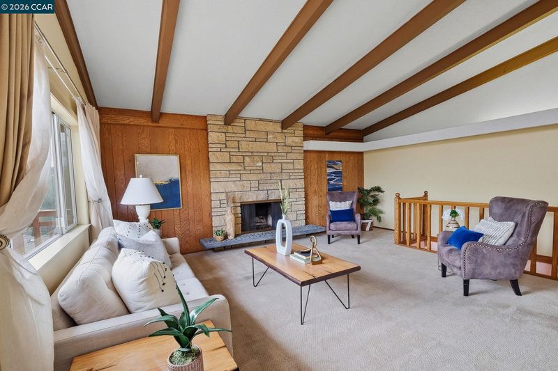 A true gem in a sought-after neighborhood, this custom & unique home captures neighboring hillside views. The main living spaces feature stunning vaulted, beamed ceilings w/windows that extend to the ceiling, creating an open & airy feel. The roomy eat-in kitchen offers ample cabinetry & counter space, spacious breakfast bar, & large picture windows showcasing the views, direct access to the newly replaced wrap-around balcony—perfect for indoor-outdoor living. A nicely sized dining room w/ceiling fan is ideal for gatherings. The spacious living room boasts a charming fireplace with a raised hearth that doubles as additional seating. The entryway features hardwood flooring, adding warmth & character. Upstairs bedrooms are generously sized & offer hardwood flooring, shutters, ceiling lights, and large windows. Downstairs you’ll find a large versatile room complete with a brick fireplace, wet bar, & bathroom, ideal as a family room, game room, work-from-home, or guest retreat. A sliding door provides direct access to the backyard & deck. Set on nearly a ¼-acre lot, the outdoor space offers endless possibilities, including a partially covered deck w/built-in benches, a large level area, fruit trees, blackberry bushes, multiple spaces to relax & enjoy peaceful setting & scenic views