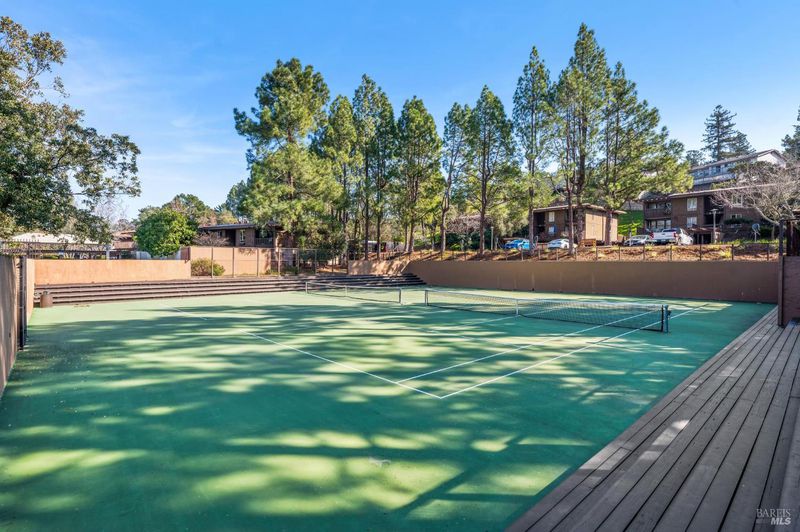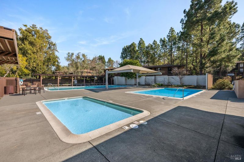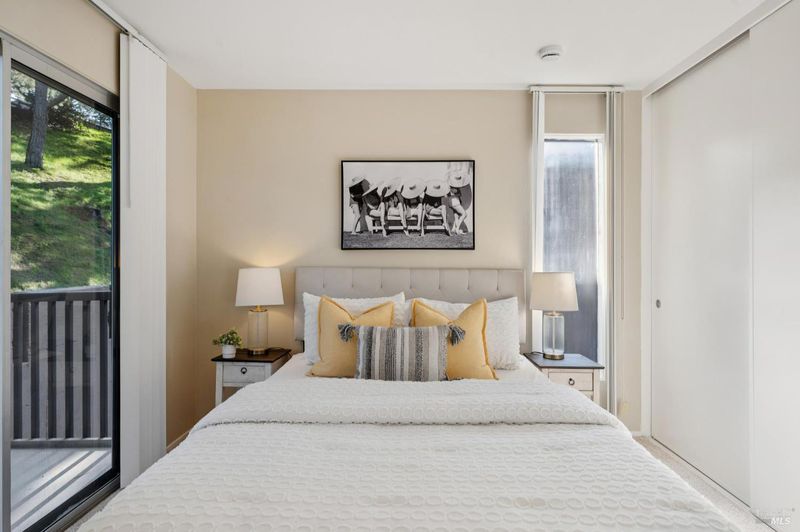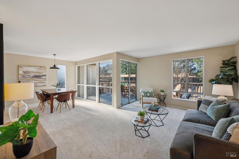 Private, serene, and sun-filled, this beautifully positioned residence enjoys the rare benefit of no shared side walls and exceptional privacy. Located one story above the carport, the unit features covered parking, a private laundry and storage area below, and convenient access via a covered walkway. One of only a few units in the community to offer an oversized front deck, this home invites you to dine, relax, and take in golden sunsets in a peaceful, elevated setting. A second outdoor living spacea generous rear patio off the second bedroomoffers tranquil views of surrounding nature and open space. The open-concept floor plan seamlessly connects the kitchen, dining area, and living room, all overlooking the sun-drenched front deckcreating an ideal layout for both everyday living and entertaining. The spacious primary suite features two closets, a dedicated dressing area, and an en-suite bath. Set on over 20 acres of lushly landscaped grounds, the community offers true resort-style amenities including a clubhouse, three swimming pools, two tennis courts, EV charging stations, and scenic walking and biking paths. Perfectly located near award-winning Miller Creek schools,