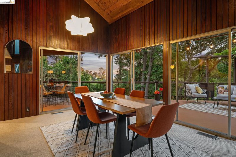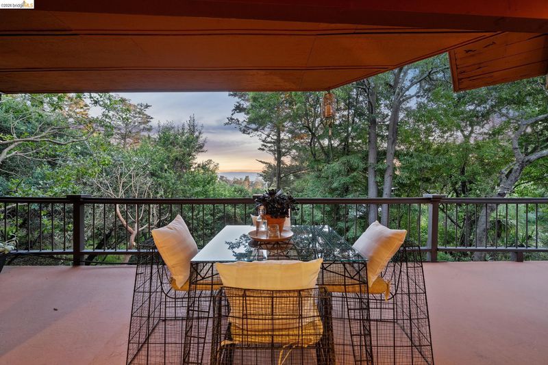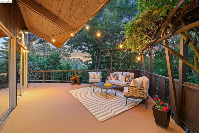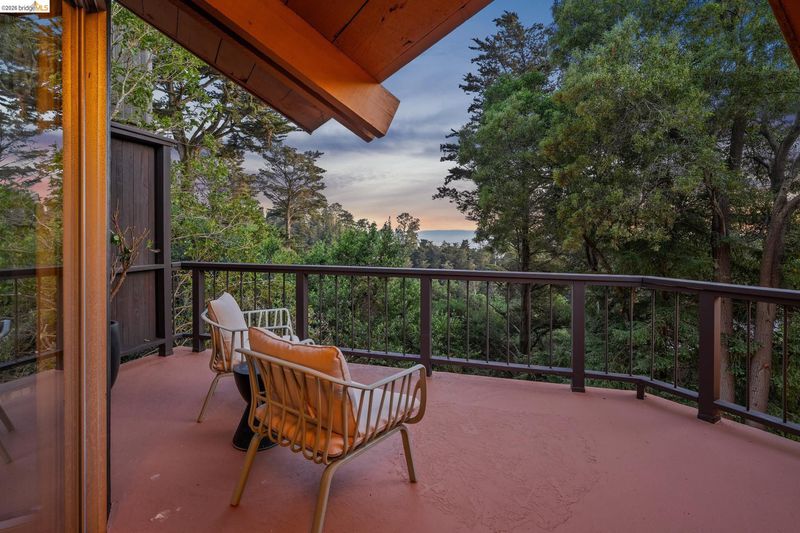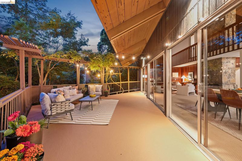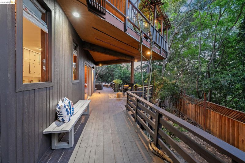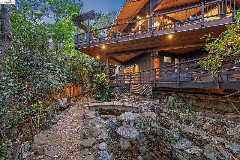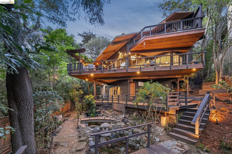 Follow the Japanese-inspired garden to a home that feels like a permanent vacation. Tucked away on a quiet cul-de-sac in coveted lower Piedmont Pines, this newly refreshed 5-bedroom mid-century gem offers the rare gift of space and serenity. The main level offers an open living and dining room, soaring ceilings, original wood-paneled walls, and three eight-foot sliders that lead to a wraparound deck with filtered Bay views. Conveniently nearby is an office/bedroom, updated kitchen featuring quartz counters, an induction stove, ample cabinetry, a breakfast bar, and a full bath and laundry with more sliders to access the deck. Family life shines on the upper level with three large bedrooms, including a primary with en-suite bathtub, redwood walk-in closet, hall bath, and an additional flexible rumpus room for play or hobbies. Meanwhile, the lower-level in-law offers a "home within a home" for guests, complete with its own entrance and a private deck leading to a cedar hot tub, pond with waterfall, and level play area. With an attached garage providing direct interior access, every corner of this home invites you to exhale. Just minutes from the heart of Montclair Village. New roof, drainage, tree removal & more!