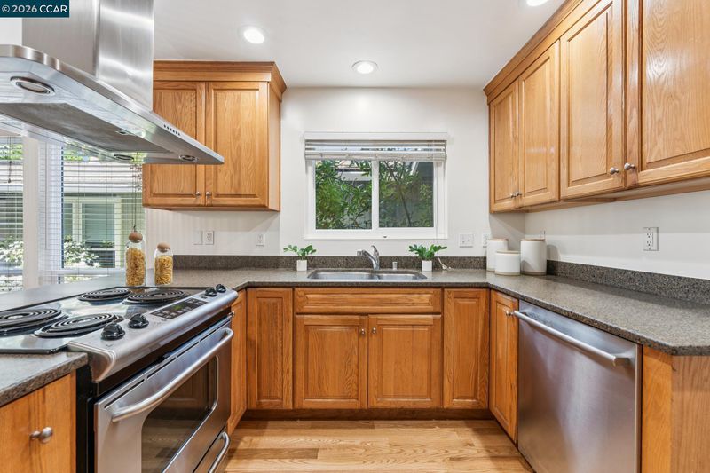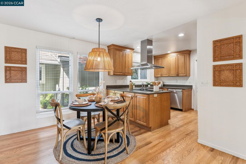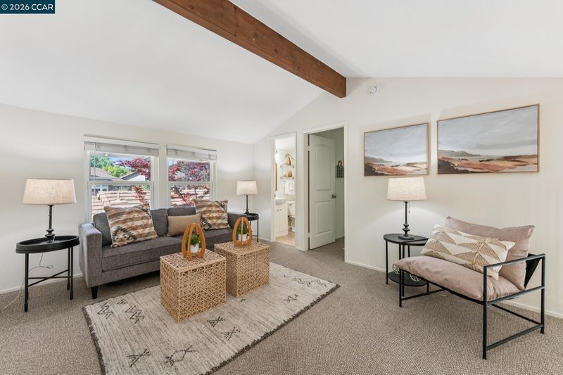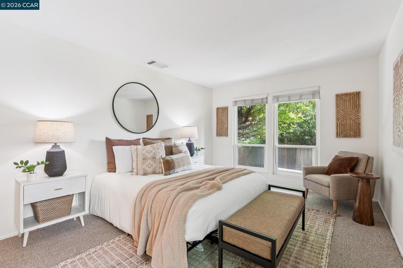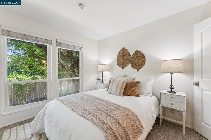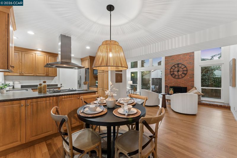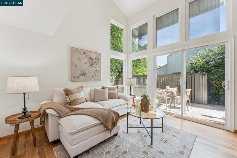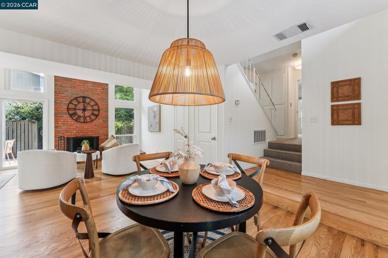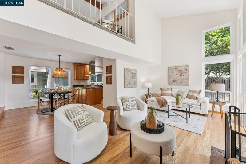 Stunning detached townhome features fabulous layout with two living spaces and inviting primary suite. The living spaces here are divine. Family room shows off with vaulted wood ceilings, woodburning fireplace & wall of windows facing the backyard. Kitchen is made for comfortable living & entertaining: with light wood cabinetry, stainless appliances + is perfectly open to the dining area. Impeccable warm hardwood floors have just been refinished, entire interior was freshly painted & new light fixtures were just installed. A primary suite offers a walk-in closet + two separate sink areas for zen morning vibes. Large windows in every room ensure sunlight filters in throughout the home. The upstairs is a dream: spacious Loft ideal for a sleepover room, library, playroom or gym area. One solo bedroom + full bath upstairs gives your teenager, house guest, or work-from-home partner a space all to themselves. The generous yard is low maintenance and beautiful w/ paving stones and a full fence. An attached 2 car garage + central heat & air = easy + comfortable living. The neighborhood delights with park-like greenbelt, pool + clubhouse. Location within Pleasant Hill is 10+: just 1 block to the walking trail, market & restaurants & 1 mile to Highway 680: perfect for commuters!