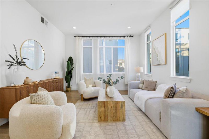 Solar-powered for low electricity bills, this 2022-built corner-lot home features soaring high ceilings and a sun-drenched open floor plan. Engineered with premium sound insulation for ultimate privacy, the residence is bathed in natural light and designed for modern luxury. Perfectly situated in the heart of Sunnyvale, it offers unparalleled commuting convenience with effortless access to Highways 101, 85, and 237, and is just minutes from Google, Meta, and NVIDIA. With an inviting front patio, a versatile side yard, and a short walk to Seven Seas Park, this home perfectly balances sustainable living with elite Silicon Valley convenience.