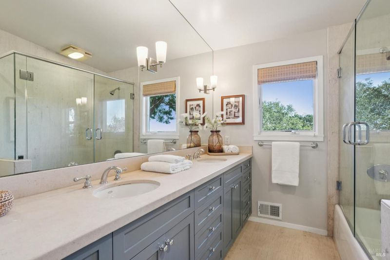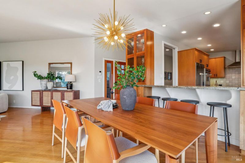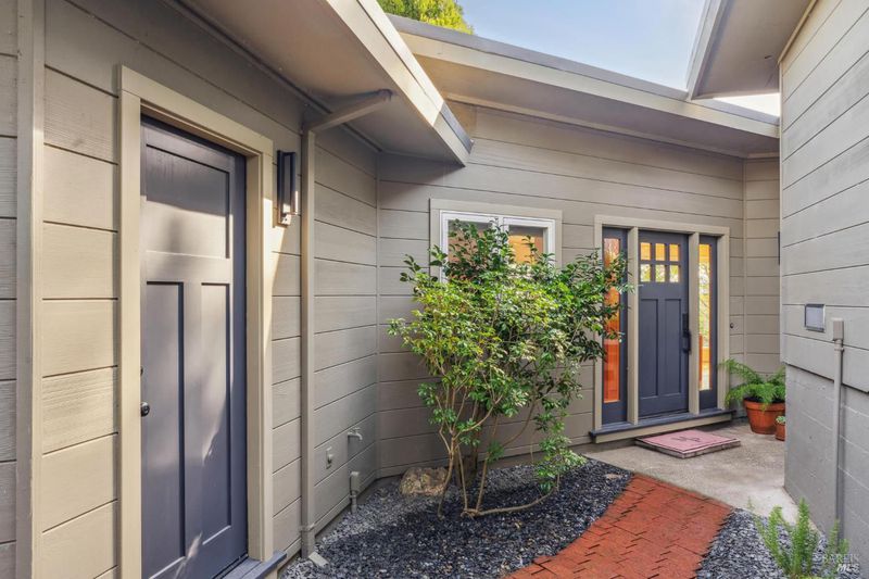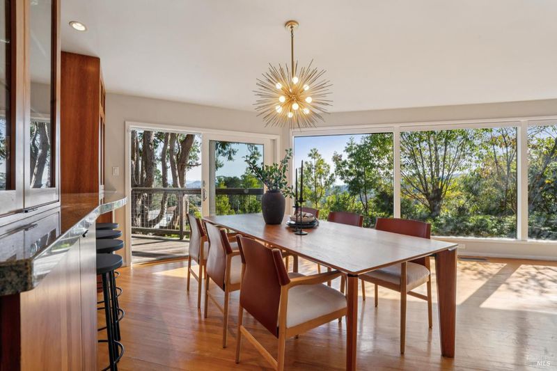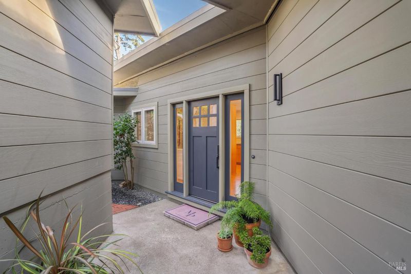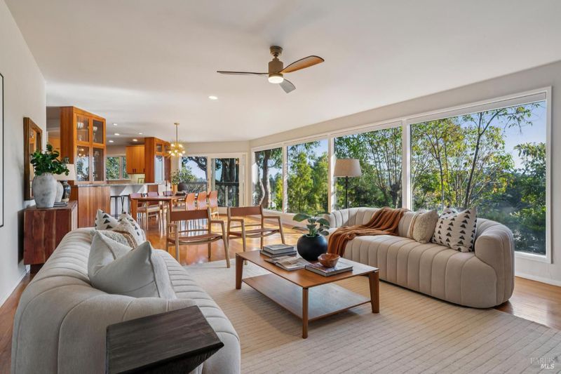 Situated at the end of a quiet, private drive, this sophisticated mid-century gem captures the best of Mill Valley living, just 15 minutes to downtown via the scenic Dipsea steps and a stone's throw to beloved neighborhood hiking trails. Blending timeless simplicity with thoughtful modern upgrades, the home showcases clean lines, wood floors, and an updated kitchen with Viking and Fisher & Paykel appliances. Expansive living room windows with Hunter Douglas motorized screen shades frame sweeping panoramic views, while the deck offers peaceful water vistas and unforgettable sunsets. Designed for effortless living, the home lives primarily on one level, with two bedrooms, a full bath with dual sinks and tub-over-shower, laundry room, kitchen, dining, and living areas all conveniently located on the main floor, ideal for everyday comfort and easy entertaining. Downstairs, a private bedroom paired with a beautifully remodeled bath creates perfect guest quarters, au pair space, or a serene home office retreat. The newly updated bath impresses with Cle Guild New California tile, Ann Sacks Savoy and Salluto tiles, Gessi Italian fixtures, a Kohler dual-flush toilet, and integrated Bluetooth sound. Comfort is elevated with a high-efficiency furnace, air conditioning, and Navien tankless water heater. Outdoors, freshly landscaped gardens offer multiple patios, drip irrigation, and a level area ideal for play or gardening. The two-car garage with glass doors presents exciting potential as a studio, gym, or creative space, complemented by a 220v EV charger and abundant additional parking, creating an effortless, open-space-adjacent sanctuary just moments from town. Welcome to 311 Edgewood Avenue!