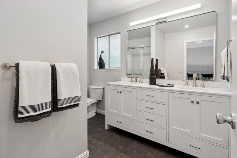 - Double Sinks, Shower and Tub, Tile, Stone, Updated Bath, Primary - Stall Shower(s)